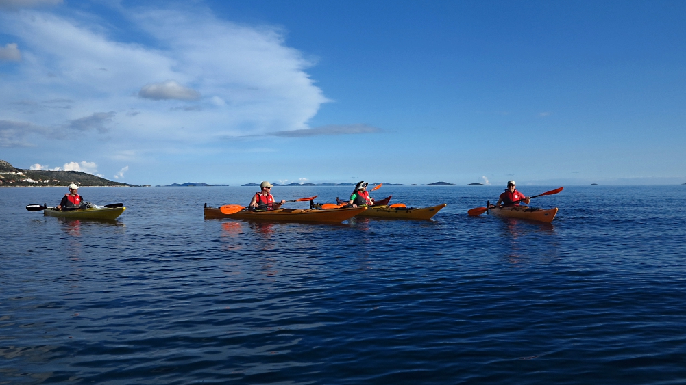 Nem túl korai ébredés, reggelizünk, majd vízreszállunk. A vízreszállás előtt megbeszéljük az előttünk álló napok programját. Az első nap túrázunk és tanulunk egymástól - felfedezzük a közeli partokat. A túra útvonalát és a program menetét az időjárás és a tenger fogja meghatározni. Az oktatás tematikus lesz - természetesen az időjárás függvényében - az első kajakos napon evezéstechnika majd a lapáttámaszoké lesz a főszerep. Az első evezős napon a szigetet félig megkerülve üres strandokat találunk, a kis kocsmák már nyitna a városkában, napfürdőzés, barnulós evezés! Terveink szerint a naplementét a vízről kapjuk el. Kajakozás, majd este vacsora egy közeli tavernában. Este pedig közös borozás, okoskodás, világmegváltás.